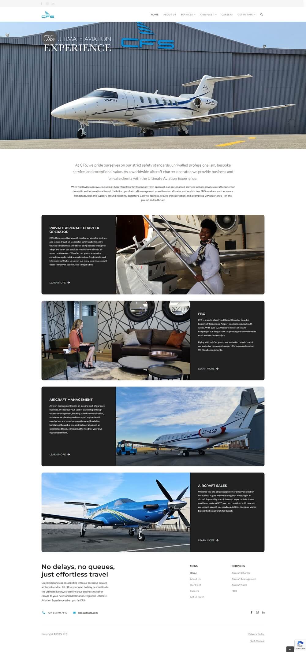 Based at Lanseria International Airport (FALA/HLA), Johannesburg, South Africa, CFS provides aircraft management, private air charter, sales and FBO services. As a private charter, they operate a broad range of modern aircraft from single-engine turboprops to large jets, enabling them to meet all their clients’ business and leisure air travel requirements.