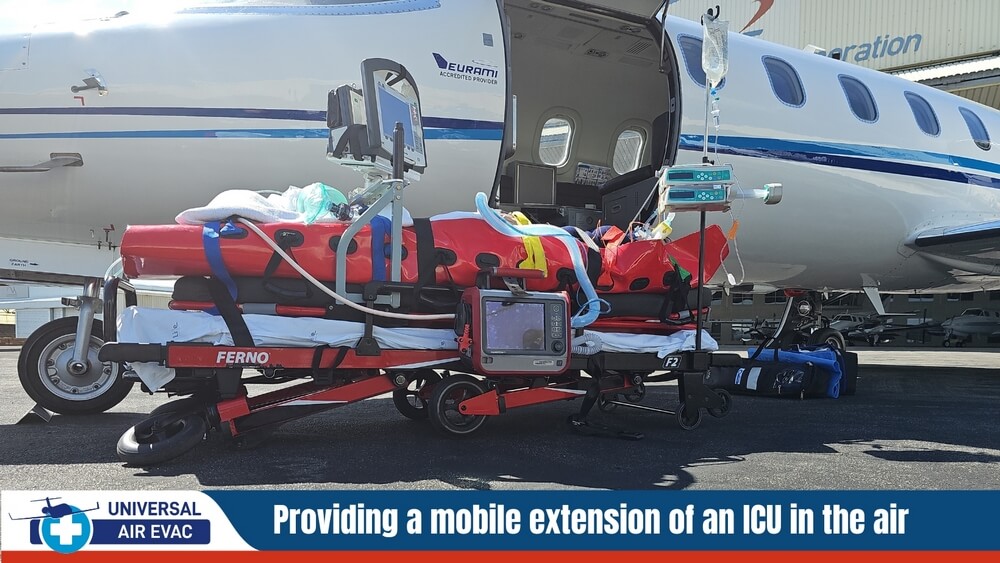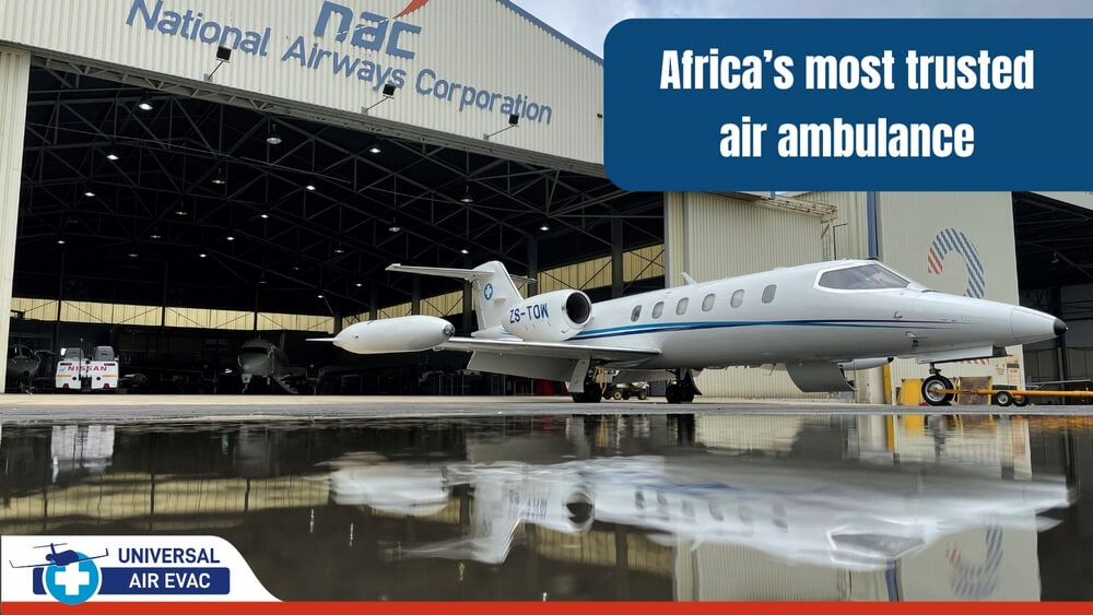 UNIVERSAL AIR EVAC is a EURAMI Accredited provider of fixed-wing air ambulance services covering the whole of Africa, it's surrounding islands into Europe. It is based at Lanseria International Airport in Johannesburg, South Africa and operates two permanently configured Learjet 35 air ambulances, offering air ambulance services and commercial medical escort services.